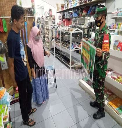 WONOGIRI lintasjatimnews – Anggota Babinsa Koramil 19/Purwantoro Kodim 0728/Wonogiri Sertu Rusdi melaksanakan patroli dan memberikan himbauan displin prokes ke toko swalayan yang berada di kecamatan Purwantoro, Jumat (17/12/2021) malam.