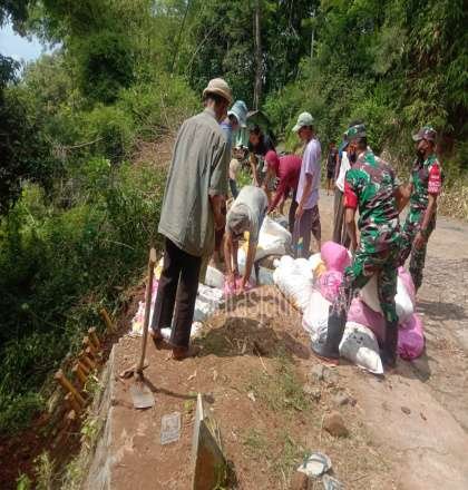 WONOGIRI lintasjatimnews – Guna mengantisipasi terjadinya longsor di musim penghujan, datang Babinsa Kelurahan Karang, Koramil 22/Slogohimo, Serda Budi Surepno bersama masyarakat saling bergotong-royong dan saling bahu-membahu memperbaiki tanggul jalan desa.