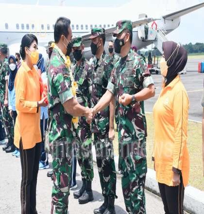 Danrem 081/DSJ, Kolonel Inf Waris Ari Nugroho dan Ketua Persit KCK Koorcab Rem 081 PD V Brawijaya, Ibu Dewi Waris Ari Nugroho turut menyambut kedatangan Panglima TNI dan Ketua Umum Dharma Pertiwi setibanya di Landasan Pacu Lanud Iswahjudi.