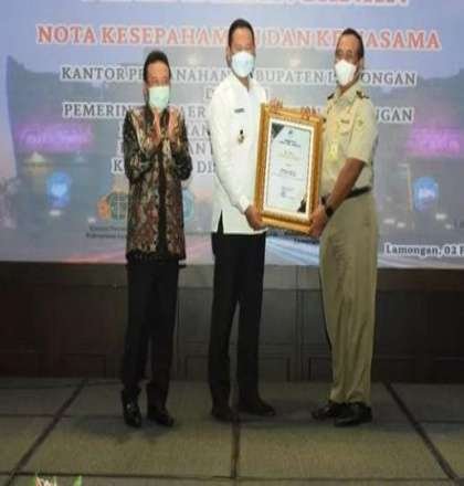 Penghargaan tersebut diserahkan langsung oleh Kakanwil BPN (Kepala Kantor Wilayah Badan Pertanahan Nasional) Jawa Timur, Johanar di Pendopo Lokatantra Lamongan, Rabu (2/2/2022).