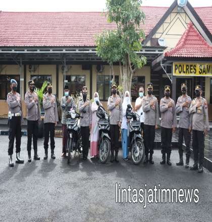 Kapolres Sampang secara simbolis menyerahkan kunci sepeda motor kepada Nafisa pelajar SMU Negeri 1 Torjun, Kursiyah alamat Dusun Duko Desa Tambelangan Kecamatan Tambelangan dan Marhadin warga Dusun Careccet Desa Tobai Tengah Kecamatan Sokobanah Sampang yang mendapatkan masing-masing sepeda motor baru honda Revo Fit.