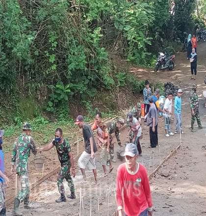 TRENGGALEK lintasjatimnews – Koramil Tipe B 0806/01 Kota jajaran Kodim 0806/Trenggalek bersama masyarakat melaksanakan kegiatan karya bakti pembangunan jalan rabat beton menuju Tempat Pemakaman Umum (TPU) Gunung Kebo di Desa Sambirejo, Kecamatan Trenggalek, Kabupaten Trenggalek, Selasa (8/2/2022).