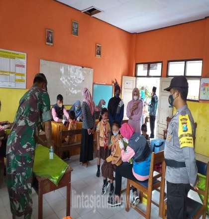 TRENGGALEK lintasjatimnews – Babinsa Koramil 0806/05 Kampak Serka Suyanto bersama Bahbinkamtibmas dampingi Petugas Kesehatan Puskesmas Kampak laksanakan vaksinasi anak usia 6 sampai 11 tahun bagi pelajar SDN 2 Timahan, Kecamatan Kampak, Trenggalek, Sabtu (12/2/2022).
