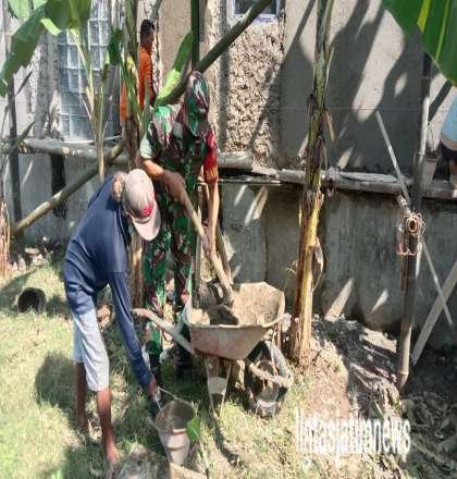 SRAGEN lintasjatimnews – Kodim Sragen – Sebagai cerminan dari kemanunggalan TNI dan Rakyat, Babinsa Desa Sukorejo anggota Koramil 08/Sambirejo Sertu Ardian Sumadio membantu warga diwilayah binaan dengan kegiatan gotong royong membantu tukang membuat adukan semen serta pemlesteran rumah bapak Tikno ketua RT 02 gempol desa Sukorejo, Senin (21/02/2022).