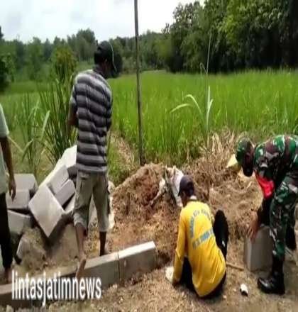 NGAWI lintasjatimnews – Babinsa Posramil 0805/Pitu, Kodim 0805/Ngawi Serma Subagyo bersama warga masyarakat melaksanakan kegiatan kerja bakti membangun pemasangan paving blok yang menghubungkan jalan persawahan ke area perkampungan warga, di Desa Selopuro Kec. Pitu Kab.Ngawi, Minggu (27/02/2022)