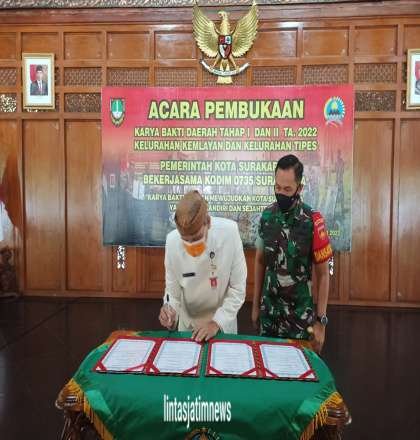 SURAKARTA lintasjatimnews – Bertempat di Pendhapi Gedhe Komplek Balaikota Surakarta Jl. Jend. Soedirman No. 2 Kelurahan Kampung Baru Kecamatan Pasarkliwon telah berlangsung Acara Pembukaan Karya Bhakti Daerah (KBD) Tahap I Dan Tahap II Tahun 2022 Kelurahan Kemlayan dan kelurahan Tipes dengan tema “Karya Bhakti Daerah mewujudkan kota Surakarta yang maju, Mandiri dan Sejahtera” yang di selenggarakan oleh pemerintah kota Surakarta bekerjasama dengan kodim 0735/Surakarta, Kamis (10/03/2022).