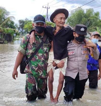 Jalanan tergenang air hingga 50cm tidak menyurutkan antusias rombongan jajaran Polres Jember mendatangi lokasi banjir.