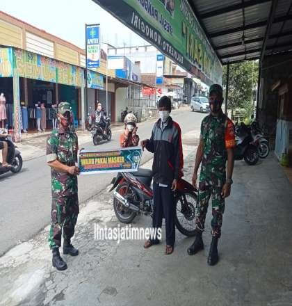 Jum’at(25/3) Anggota Koramil 21/Bulukerto Pelda Budi, Serma Sumanto dan Serda Ortizal Apoki, dengan berkeliling menyusuri pertokoan yang ada di Kecamatan Bulukerto, mereka menyampaikan pesan dan himbauan agar pemilik toko serta pembeli selalu patuh dengan menerapkan protkes.