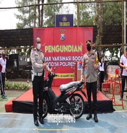 Kapolres Batu AKBP I Nyoman Yogi Hermawan hadir dalam kegiatan Gebyar Doorprize Vaksinasi Booster Anggota yang dilaksanakan di Lapangan Olah Raga Polres Batu, Sabtu (26/3/2022).