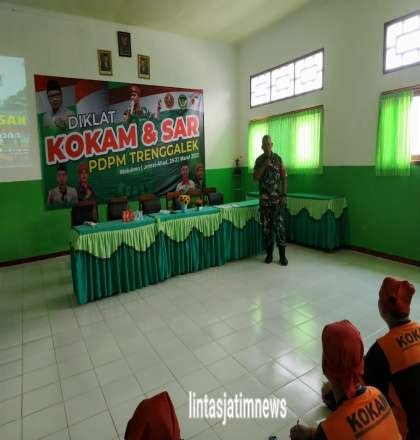 TRENGGALEK lintasjatimnews – Pasi Intel Kodim 0806/Trenggalek Kapten Inf Bambang Subani memberikan materi Bela Negara Wawasan Kebangsaan (Wasbang) kepada peserta Diklatsar Komando Kesiapsiagaan Angkatan Muda Muhammadiyah (KOKAM) yang SMK Muhammadiyah Watulimo, Kecamatan Watulimo, Trenggalek, Sabtu (26/03/2022).