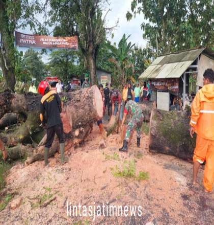 Pasca terjadinya hujan lebat yang disertai angin kencang kemarin mengakibatkan pohon tumbang hingga menutup badan jalan sehingga arus lalu lintas maupun sebaliknya tidak bisa dilewati.