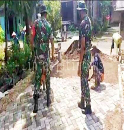 Saat berada dilokasi, Sertu Darmono ikut terjun ke lapangan membantu warga setempat dalam pemasangan paving blok jalan Desa.