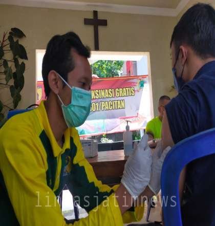 PACITAN lintasjatimnews – Sistem mobile atau jemput bola vaksinasi covid-19 yang dilakukan Kodim 0801/Pacitan berkolaborasi dengan Polkes 05.09.11 Pacitan berjalan cukup efektif. Saat ini Kegiatan vaksinasi dengan menyediakan sebanyak 3 jenis dosis vaksin Covid 19 dilaksanakan diwilayah Koramil 0801/01 Pacitan tepatnya di Gereja Kristen Jawi Wetan (GKJW) Jemaat Pacitan Jl. Kolonel Sugiono No.2, Palihan, Pucangsewu, Kecamatan Pacitan, Kabupaten Pacitan . Jumat (15/04/2022).