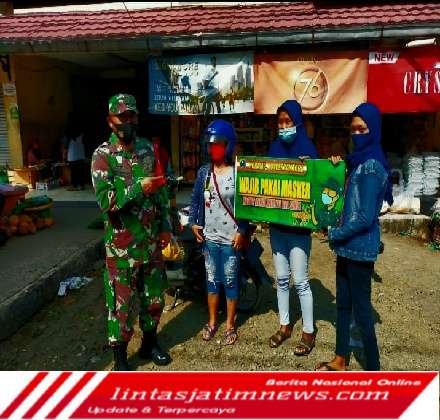 Seperti yang dilaksanakan oleh Sertu Masyudi dan Serda Dwiyanto, dengan berkeliling pasar menyambangi penjual maupun pembeli yang ada untuk memberikan himbauan penerapan protocol kesehatan yang harus selalu diterapkan dalam kehidupan sehari-hari.