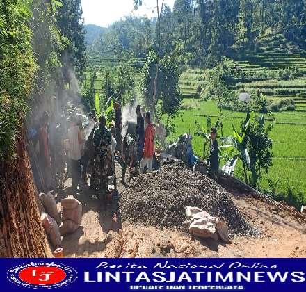 Dengan penuh semangat, para personel Satgas TMMD ke 113 Kodim 0802/Ponorogo bersama warga melaksanakan pengecoran jalan Dukuh Ngandel, Desa Cepoko, Kecamatan Ngrayun, Kabupaten Ponorogo.