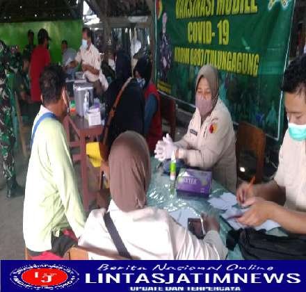 TULUNGAGUNG lintasjatimnews – Kodim 0807/Tulungagung terus gencarkan vaksinasi. Menggandeng Polkes 05.09.09 Tulungagung, tim vaksinator gelar vaksinasi massal di Pasar Campurdarat Kecamatan Campurdarat Kabupaten Tulungagung Jawa Timur, Kamis (19/05/2022).