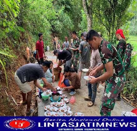 Anggota satgas pimpinan Lettu Arh Agus Ciltri bersama warga yang ada di lokasi sasaran fisik peningkatan jalan Dusun Tanggung tentu tidak menyia – nyiakan hal tersebut dan langsung mendekati piring – piring yang sudah diisi makanan oleh Bu Kitri dan rekan – rekan.