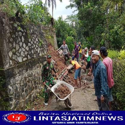 TRENGGALEK lintasjatimnews – Babinsa Koramil 0806/07 Watulimo jajaran Kodim 0806/Trenggalek Serka Masngut bersama Bhabinkamtibmas dan warga bergotong – royong membuka akses jalan yang tertutup timbunan material longsor di wilayah RT. 27 RW. 01 Desa Gemaharjo, Kecamatan Watulimo, Kabupaten Trenggalek, Rabu (22/03/2022).