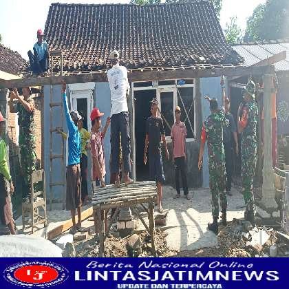 NGAWI lintasjatimnews – Anggota Koramil Kwadungan Kodim 0805/Ngawi Serda Yudho bersama dua orang anggota yang lainnya membantu masyarakat melaksanakan gotong-royong perbaikan rumah bertempat di Desa Jenangan Kecamatan Kwadungan, Minggu (26/06/2022).