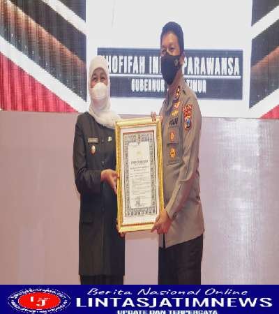 SURABAYA lintasjatimnews – Gubernur Jawa Timur, Khofifah Indar Parawansa mendapat penganugerahan Pin Emas dan Piagam Penghargaan dari Kapolri Jenderal Listyo Sigit Prabowo. Penghargaan ini diberikan oleh Kapolda Jatim, Irjen Pol Nico Afinta atas nama Kapolri tepat di Hari Bhayangkara ke-76, Jumat (1/Juli/2022).