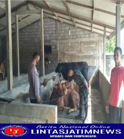 Babinsa dan Babinkamtibmas menyambangi peternakan sapi untuk memantau ada tidaknya kasus penyakit mulut dan kuku yang terjadi.