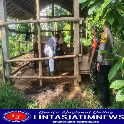 TRENGGALEK lintasjatimnews – Babinsa Pule Koptu Tulus Koramil 0806/10 Pule jajaran Kodim 0806/Trenggalek bersama Bahbinkamtibmas melaksanakan pendampingan Petugas Dinas Peternakan untuk memberikan vaksin terhadap hewan ternak sapi milik warga Desa Pule, Kecamatan Pule, Kabupaten Trenggalek, Minggu (03/07/2022).