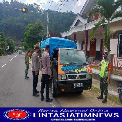 Guna mencegah penyebaran wabah Penyakit Mulut dan Kuku (PMK), Babinsa Koramil 0801/04 Tegalombo Kodim 0801/Pacitan dan Bhabinkamtibmas beserta Dinas terkait, melakukan penyekatan di jalur jalan raya Pacitan-Ponorogo Kec. Tegalombo Kab. Pacitan, Rabu (06/07/2022).