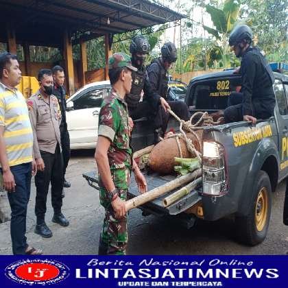 TRENGGALEK lintasjatimnews – Babinsa Koramil 0806/01 Trenggalek Serda Suradi dampingi Tim Gegana Brimob Polda Jatim mengevakuasi Aerial Bom (Bom Udara) sisa perang dunia kedua yang diduga masih aktif di Kelurahan Surodakan, Kecamatan Trenggalek, Kabupaten Trenggalek, Sabtu (16/07/2022).