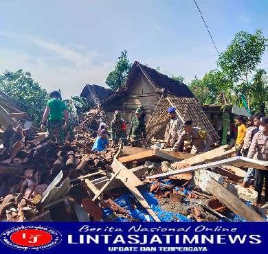 NGAWI lintasjatimnews – Pasca terjadinya hujan lebat yang disertai angin kencang melanda di wilayah kabupaten Ngawi sore kemarin, anggota Pos Koramil Pangkur Kodim 0805/Ngawi bersama masyarakat melaksanakan karya bakti pembersihan puing-puing rumah yang roboh akibat terjangan angin puting beliung di rumah bapak Sukir Dusun Karasan, Desa Waruk Tengah, Kecamatan Pangkur, Kabupaten Ngawi, Minggu (09/10/2022).