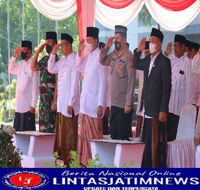 GRESIK lintasjatimnews – Kapolres Gresik AKBP Mochamad Nur Azis bersama jajaran forkopimda mengikuti upacara peringatan Hari Santri Nasional (HSN) 2022 di Halaman Kantor Bupati Gresik, Sabtu (22/10/2022). HSN tahun ini mengangkat tema Berdaya Menjaga Martabat Kemanusiaan.