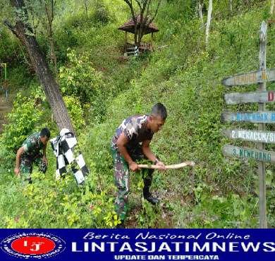 PONOROGO lintasjatimnews – Bati Komsos Koramil Tipe B 0802/10 Slahung, Serma Darmawan bersama sembilan orang prajurit dari Koramil Tipe B 0802/10 Slahung hari ini melaksanakan kerja bakti di sekitar taman rest area Tugurejo, Kecamatan Slahung, Kabupaten Ponorogo, Selasa (25/10/2022).
