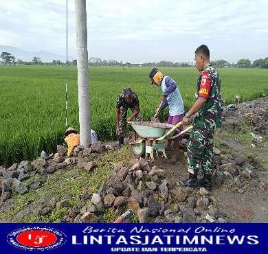 NGAWI lintasjatimnews – Anggota Babinsa Koramil 0805/06 Kwadungan Kodim 0805/Ngawi bersama warga sedang membantu pengerjaan talut irigasi pertanian di Desa Kwadungan, Kecamatan Kwadungan, Kabupaten Ngawi, Minggu (30/10/2022).