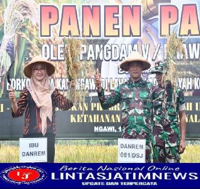 NGAWI lintasjatimnews – Danrem 081/DSJ Kolonel Inf Deni Rejeki bersama Forkopimda Ngawi melakukan panen raya padi di Desa Bangunrejo Kidul, Kecamatan Kedunggalar, Kabupaten Ngawi.