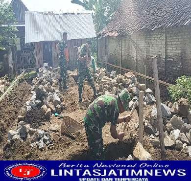 NGAWI lintasjatimnews – Untuk meningkatkan hubungan dengan warga binaan, Babinsa Koramil Kwadungan Kodim 0805/Ngawi Koptu Agus Puji bersama dengan dua anggota membantu warga dalam membangun rumah milik bapak Warsono bertempat di Desa Banget Kecamatan Kwadungan, Minggu (20/11/2022).