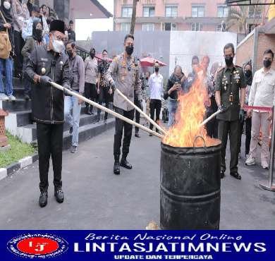 KOTAMALANG lintasjatimnews – Polresta Malang Kota yang bersama Forkopimda Kota Malang, Forum Kerukunan Umat Beragama (FKUB) dan Badan Narkotika Nasional (BNN) Kota Malang, memusnahkan sejumlah barang terlarang, di halaman depan Ballroom Polresta Malang Kota.
