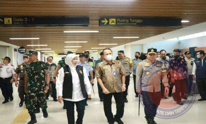 Di bandara juanda Forkopimda meninjau posko pelayanan maupun Gate penumpang keberangkatan maupun kedatangan.