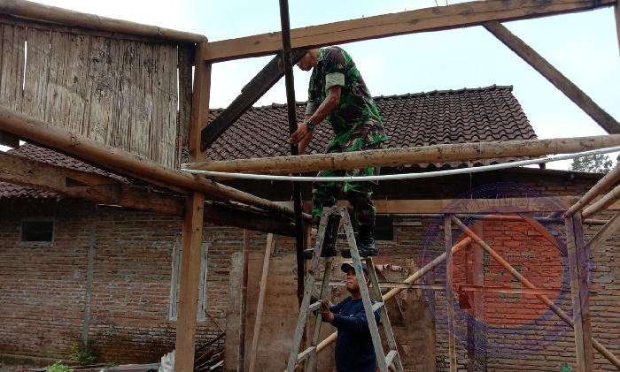 Babinsa Serma Sugito bersama warga melaksanakan gotong-royong perbaikan rumah milik Ahmad Saebani ( 52 ) di Dukuh Ngunduhrejo Desa butuh Kecamatan Mojosongo Kabupaten Boyolali. Jumat( 23/12/22).