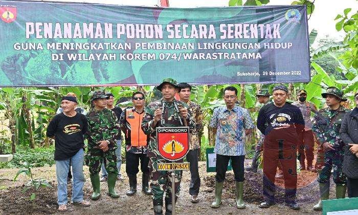 SUKOHARJO lintasjatimnews.com -Dandim 0726/Sukoharjo Letkol Czi Slamet Riyadi, S.E mendampingi Danrem 074/Warastratama Kolonel Inf Anan Nurakhman S.I.P melaksanakan Pembinaan Lingkungan Hidup di Wilayah Korem 074/Warastratama melalui Penanaman Pohon Secara Serentak tepatnya di lima titik di wilayah Kodim 0726/Sukoharjo, Kamis (29/12/22).