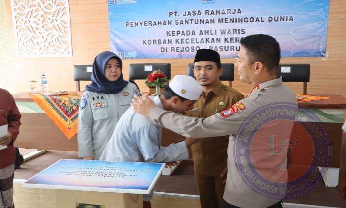KOTA PASURUAN lintasjatimnews.com – Muhammad Sholeh Marzuqi (14), anak sulung korban satu keluarga yang tewas tertabrak kereta api (KA) menerima santunan dari Jasa Raharja.