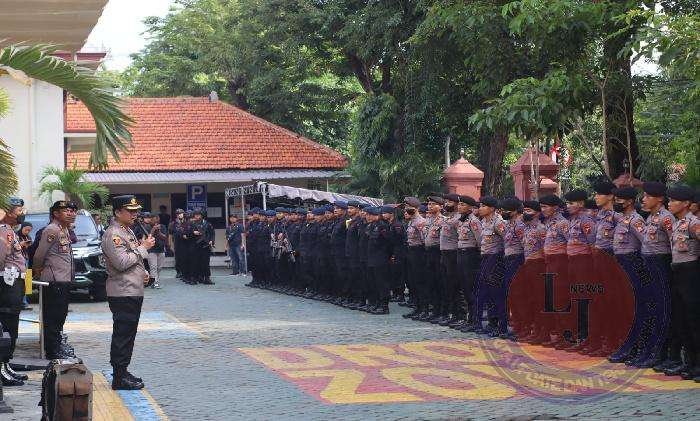 Sebelum pengamanan sidang, ratusan personel gabungan dari Polrestabes Surabaya dan Polda Jatim menggelar apel di halaman PN Surabaya.