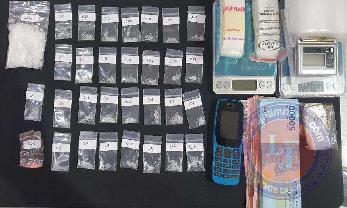 Dari kasus itu, polisi mengamankan barang bukti 30 bungkus plastik berisi kristal putih yang diduga narkotika jenis sabu dengan berat masing – masing 22,64, 0,40, 0,40, 0,40, 0,40, 0,40, 0,40, 0,40, 0,38, 0,38, 0,38, 038, 0,42, 0,42, 0,44, 0,46, 0,46, 0,46, 0,46, 0,46, 0,48, 0,48, 0,48, 0,48, 0,48, 0,50, 0,50, 0,52, 0,52, 0,58 gram serta bungkusnya.