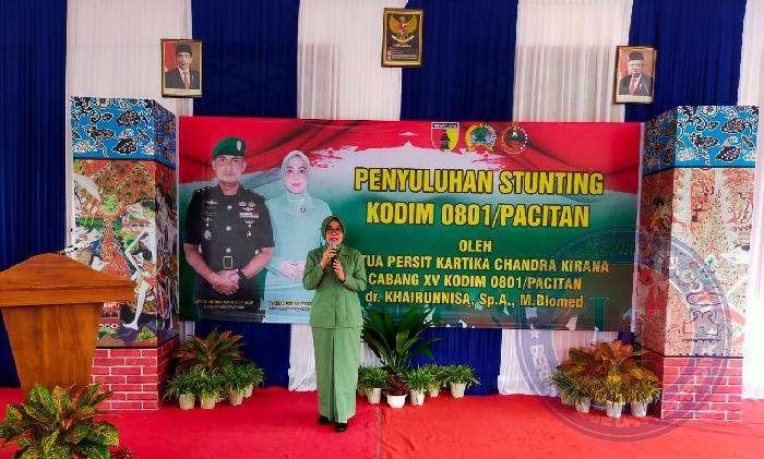 PACITAN lintasjatimnews.com – Dalam rangka upaya pencegahan dan menurunkan terhadap masalah Stunting kali ini Kodim 0801/Pacitan melakukan penyuluhan dan sosialisasi kepada masyarakat, yang di sampaikan oleh Ketua Persit Kartika Chandra Kirana Cabang XV Pacitan, dr Khairunnisa, Sp. A., M. Biomed bertempat di Kantor Kecamatan Donorojo Kab. Pacitan, Kamis (19/01/2023).