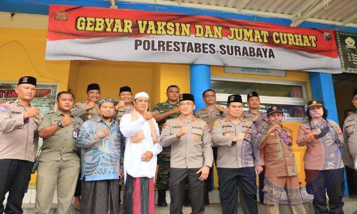 Kapolrestabes Surabaya Polda Jatim , Kombes Pol Akhmad Yusep menyapa warga Bangkingan Surabaya setelah pelaksanaan sholat Jumat. Kemudian dilanjutkan dengan vaksinasi boster secara masal Halaman Masjid sebanyak 100 dosis.