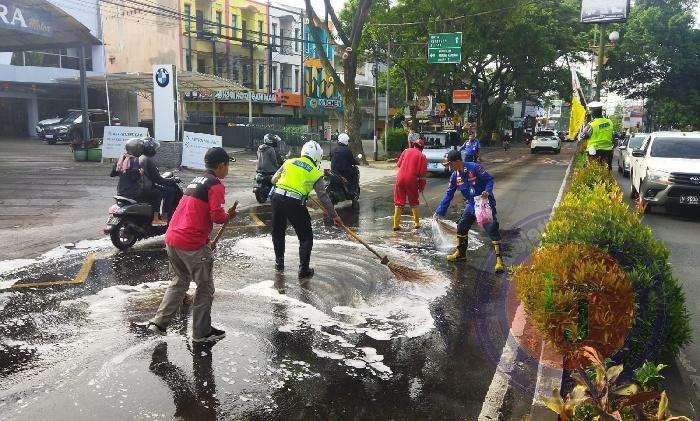 Proses pembersihan tumpahan solar dilakukan oleh tim dari PMK Kota Malang dengan menurunkan 2 unit mobil dan dibantu oleh anggota Satlantas Polresta Malang Kota.