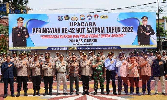 GRESIK lintasjatimnews.com – Kapolres Gresik AKBP Adhitya Panji Anom sebagai Inspektur Upacara (Irup) pada peringatan HUT ke-42 Satuan Pengamanan (satpam). Upacara peringatan dilaksanakan di lapangan Mapores Gresik, Senin (30-01-2023).