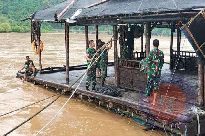 “Sampah kayu yang terbawa arus sungai saat terjadi hujan deras, kemudian menyangkut pada bagian tali jangkar Masjid.Karena tidak kuat menahan beban, kedua tali penguat Masjid tersebut putus”, terang Danramil saat berada lokasi melakukan pembenahan Masjid.