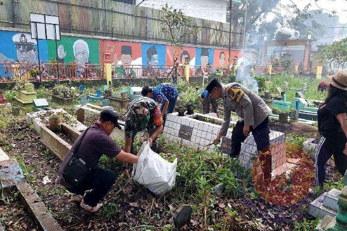 Kerja bakti pada TPU ini melibatkan Babinsa, Bhabinkamtibmas dan warga sekitar yang dipimpin oleh Kanitbinmas Polsek Sukun Polresta Malang Kota Ipda Dian W.