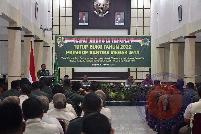 MADIUN lintasjatimnews.com – Korem 081/DSJ menggelar kegiatan Rapat Anggota Tahunan (RAT) tutup buku 2022 Primkop Kartika Merak Jaya, dengan mengusung tema “Kita Mantapkan Penataan Koperasi Yang Sehat Usaha, Organisasi dan Keuangan Secara Terpadu Menuju Koperasi Mandiri, Maju dan Profesional”
