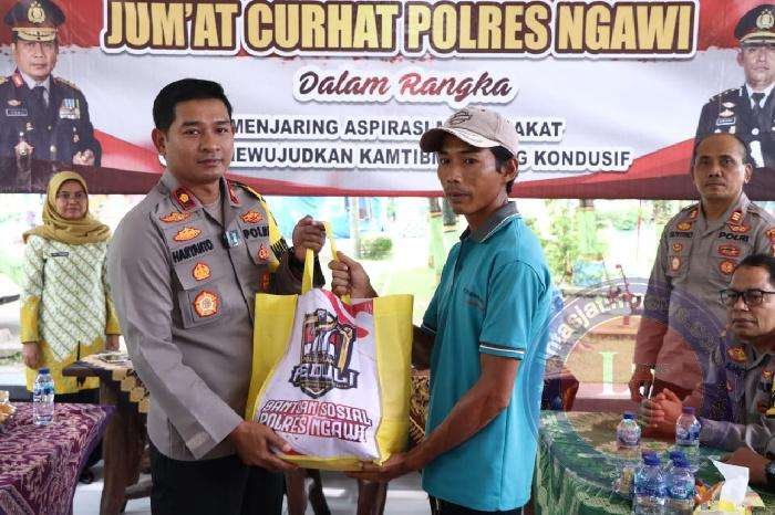 NGAWI lintasjatimnews.com – Pada kegiatan Jumat Curhat yang rutin digelar oleh Polres Ngawi jajaran Polda Jatim ini, bukan hanya sekedar mendengarkan keluhan masyarakat namun juga berbagi berkah untuk warga yang dinilai membutuhkan.
