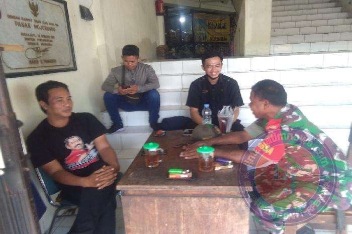 SURAKARTA lintasjatimnews.com – Babinsa Koramil 04/Jebres Kodim 0735/Surakarta Serka Dominggus dan Serka Aswan, melaksanakan Komunikasi Sosial (Komsos) dengan security dan petugas kebersihan pasar bertempat di Pasar Mojosong Jln Brigjen Katomso, Kelurahan Mojosongo, Kecanatan Jebres, Senin, (13/02/2023).